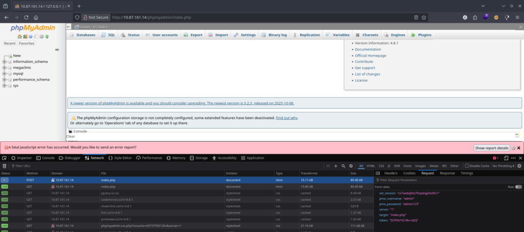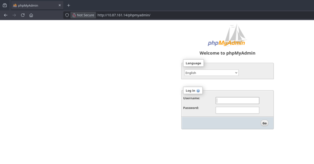 Crucially, the directory listing exposed a folder named /phpmyadmin/. In a secured environment, this path should be hidden or restricted. Here, it was my entry point.
