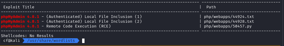 I verified the phpMyAdmin version (4.8.1). A quick search in searchsploit pointed to a critical vulnerability: Local File Inclusion (LFI).