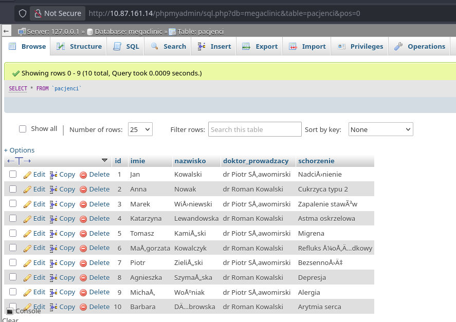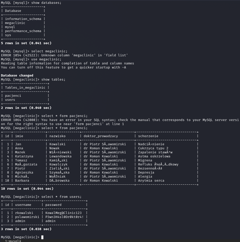 To demonstrate the real-world impact of this breach beyond just „getting root,” I checked the database contents. I had full access to the megaclinic database, including the pacjenci (patients) table.