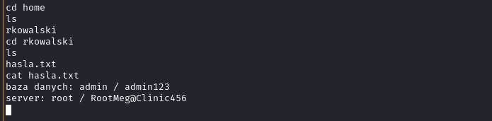 With shell access, I began enumerating the file system. I navigated to /home and found a user directory rkowalski. Inside, I struck gold: a file named hasla.txt (passwords.txt).